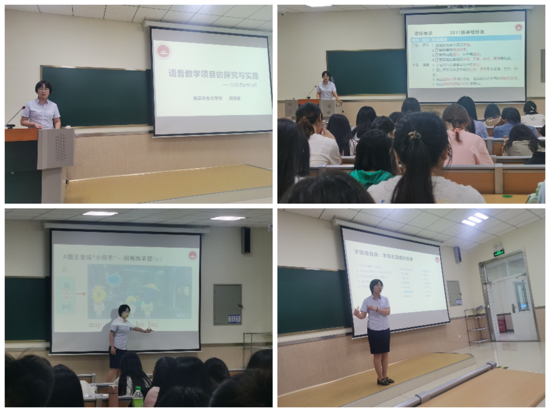 5月22日晚,外国语学院邀请曲阜市东方学校英语学科主任、一级教师胡婉君老师作了题为“语音教学项目的探究与实施-以拼读教学为例”的报告。外国语学院2022级小学英语教育专业全体同学和相关任课教师参加了本次活动。