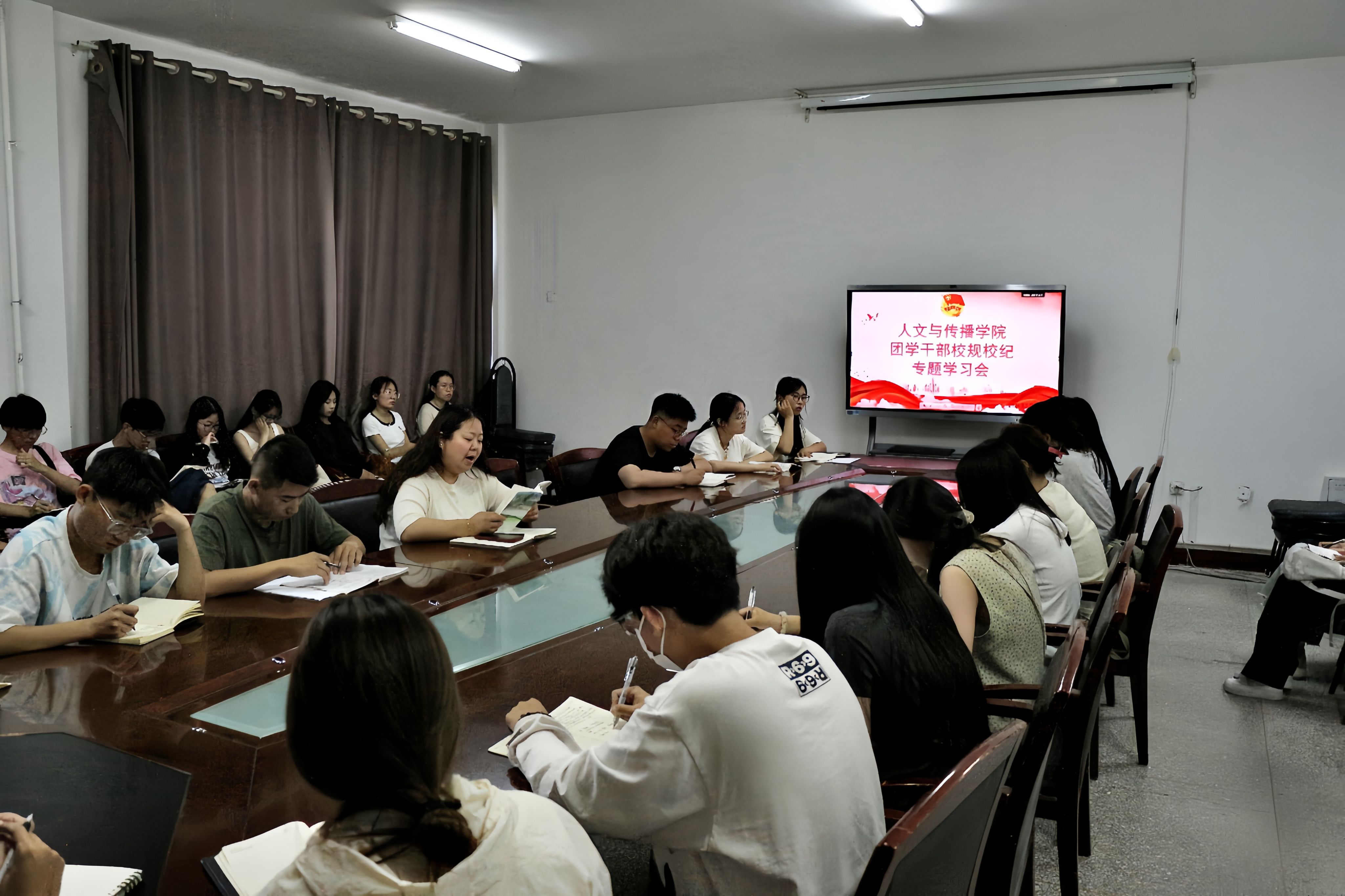 5月27日下午,人文与传播学院在会议室召开团学干部校规校纪专题学习会,该院团委成员、各团支部委员、学生会干部参加学习,该院党委副书记岳现超到会指导,会议由团委副书记张甜主持。