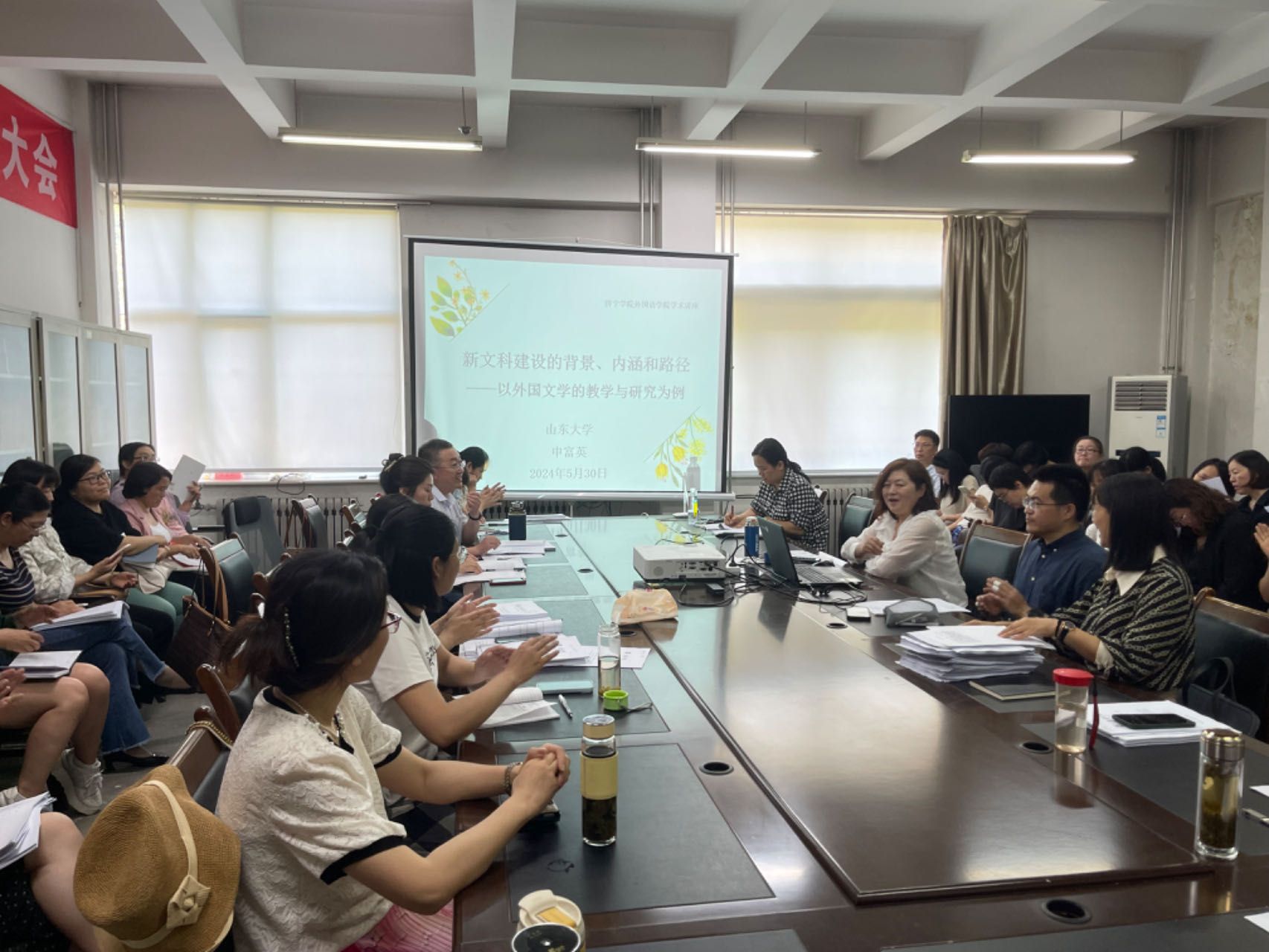 随后,申富英与外国语学院老师们就教材的意识形态建构、课程设置、课堂教学改革、学术研究的实践性等问题进行了深入交流。范莉进行了总结,她认为申富英教授的讲座高屋建瓴,在梳理新文科建设核心理念的基础上对外国文学专业存续问题的分析切中肯綮,不但为新时代中国外国文学的教学与研究的创新性发展带来新的思考和启发,同时也为正处于转型中的外国语学院提供了宝贵的指引。