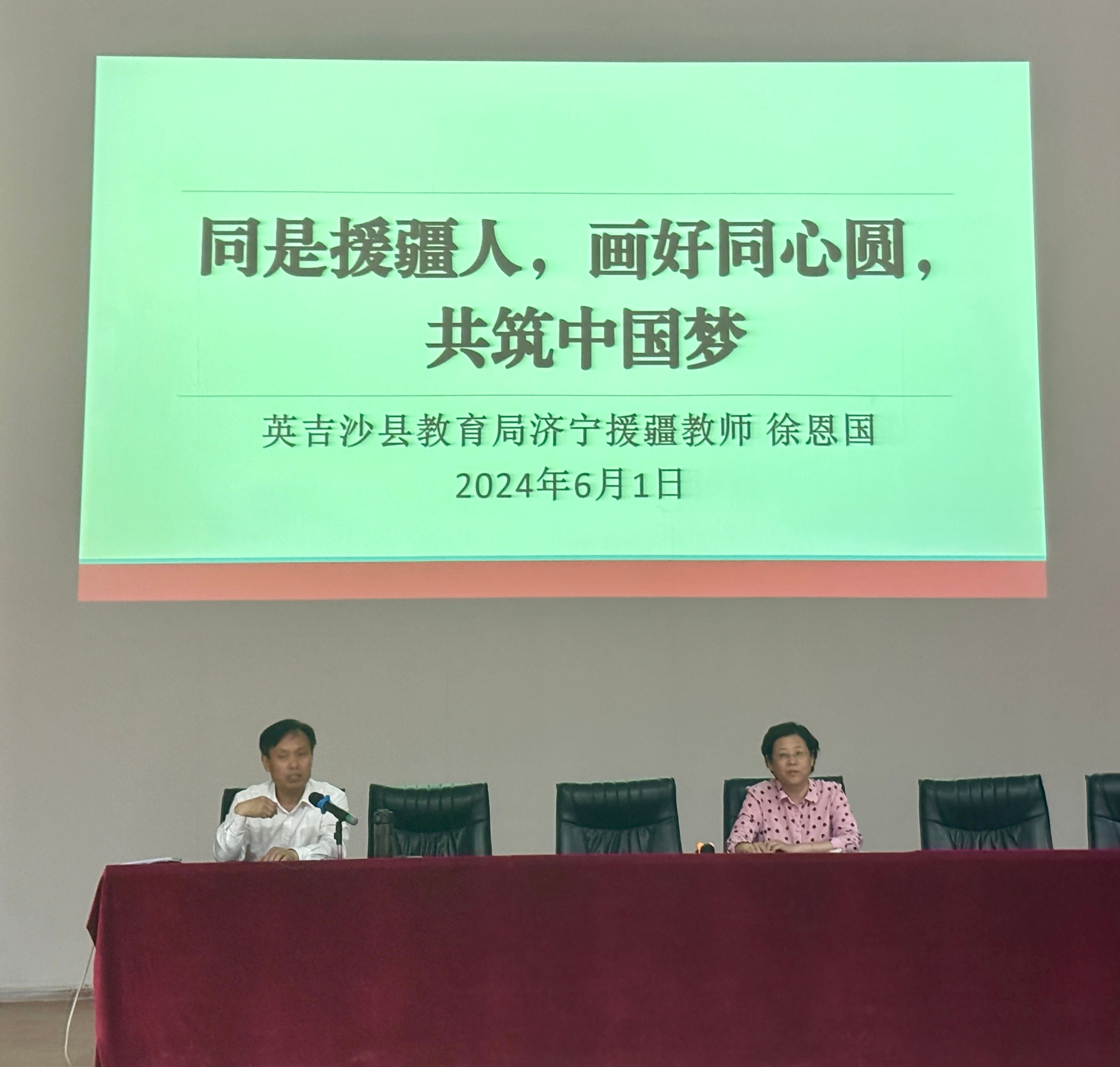 为提升支教团大学生的教育教学能力,提高师范生的专业素养,6月1日,济宁学院援疆支教团特邀请山东济宁援疆教师,现英吉沙县教研室副主任、英吉沙县教育发展中心主任徐恩国,以“同是援疆人,画好同心圆,共筑中国梦”为题进行了专题讲座。讲座由济宁学院援疆支教团团长葛艳丽主持,支教团全体成员参加。