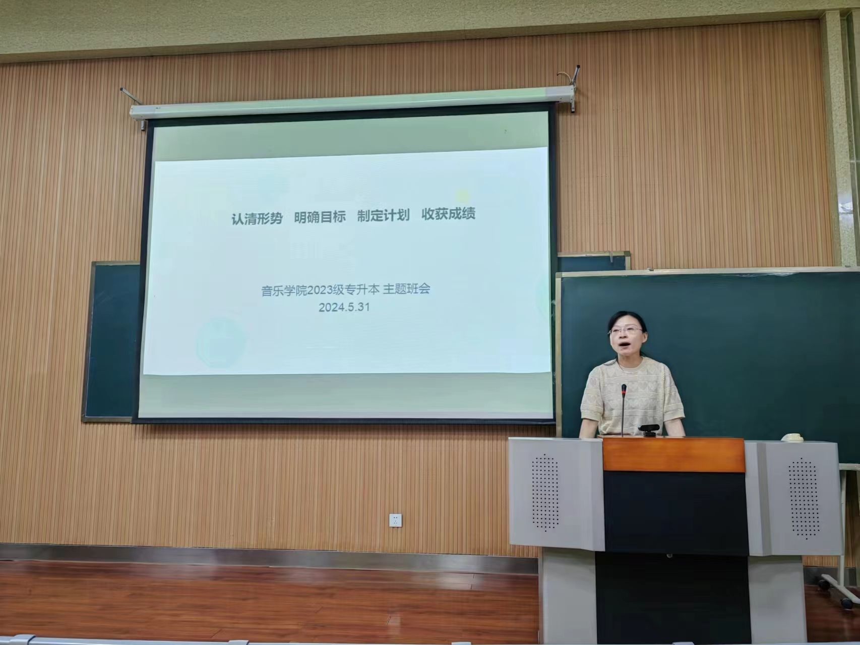 为加强专升本班级学风建设工作,5月31日晚,音乐学院在4号楼101教室召开了“认清形势、明确目标、制定计划、收获成绩”为主题的年级会议。本次会议由学院党委副书记岳娜主持,辅导员和全体2023级专升本班级同学参加。