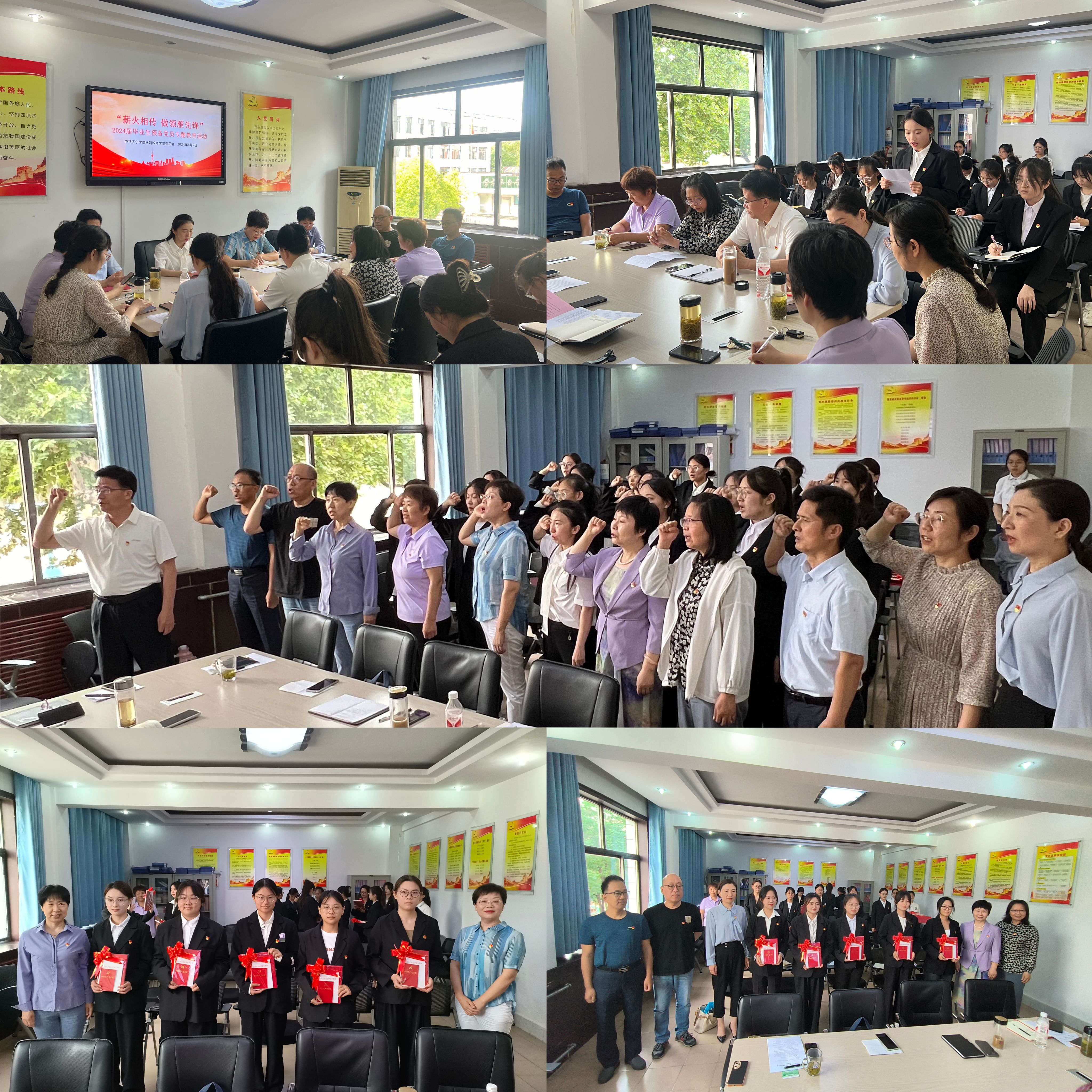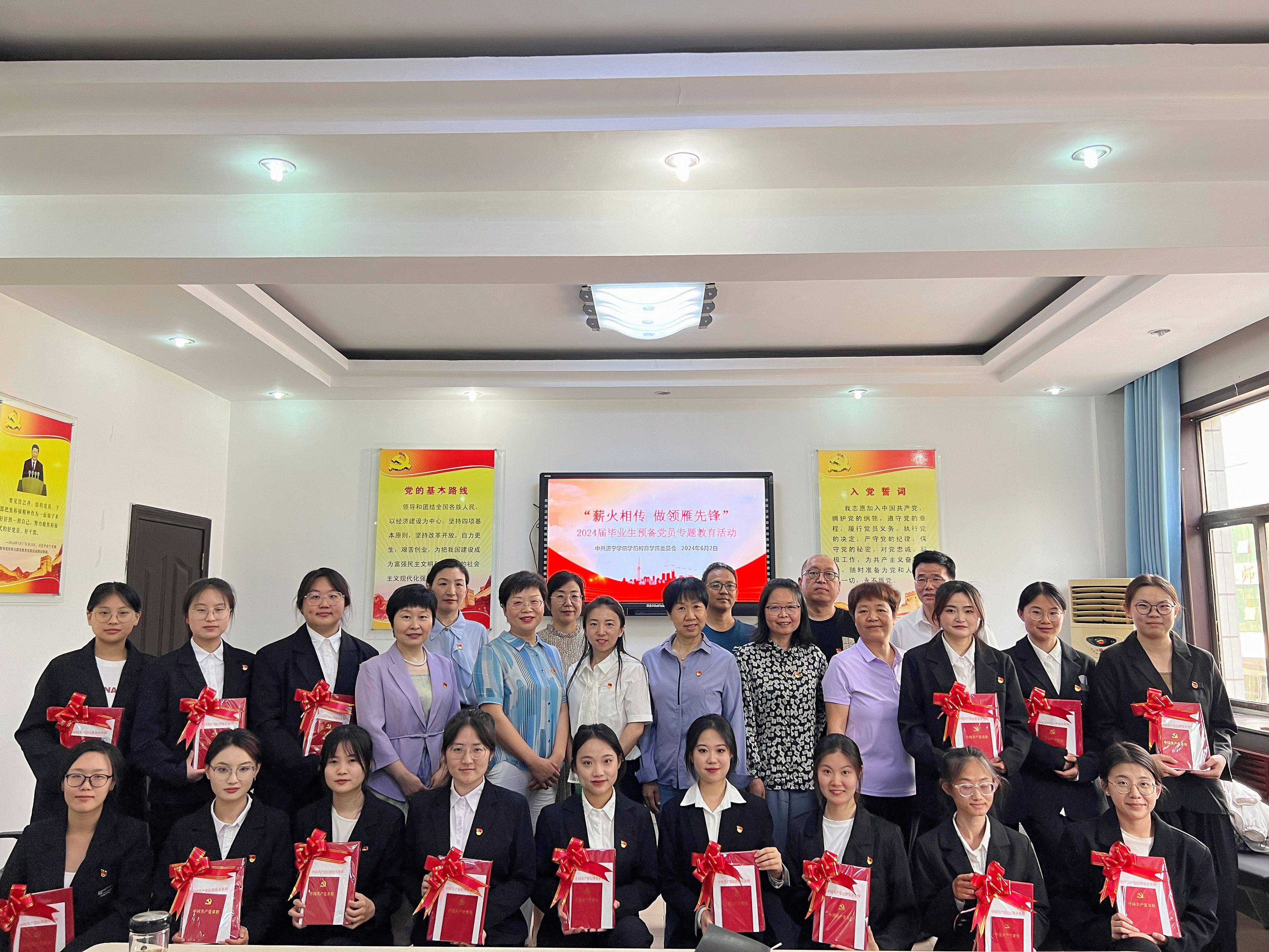 6月2日下午,学前教育学院学生党支部在党员活动室举办“薪火相传 做领雁先锋”2024届毕业生预备党员离校前专题教育活动。党委副书记丰琳琳、学生党支部全体党员、入党介绍人及15名毕业生预备党员参加活动,党支部书记于思思主持会议。