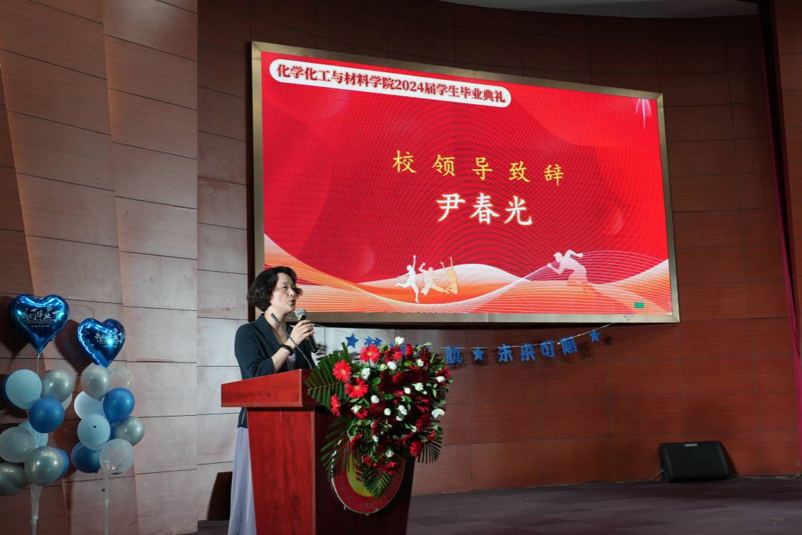 启航新征程,筑梦向未来,6月19日下午,化学化工与材料学院2024届学生毕业典礼在理科楼报告厅举行。校党委委员、副校长尹春光受邀出席,学院班子成员、毕业班班主任、教师代表和全体辅导员共同见证了毕业生的重要时刻。毕业典礼由副院长张建主持。
