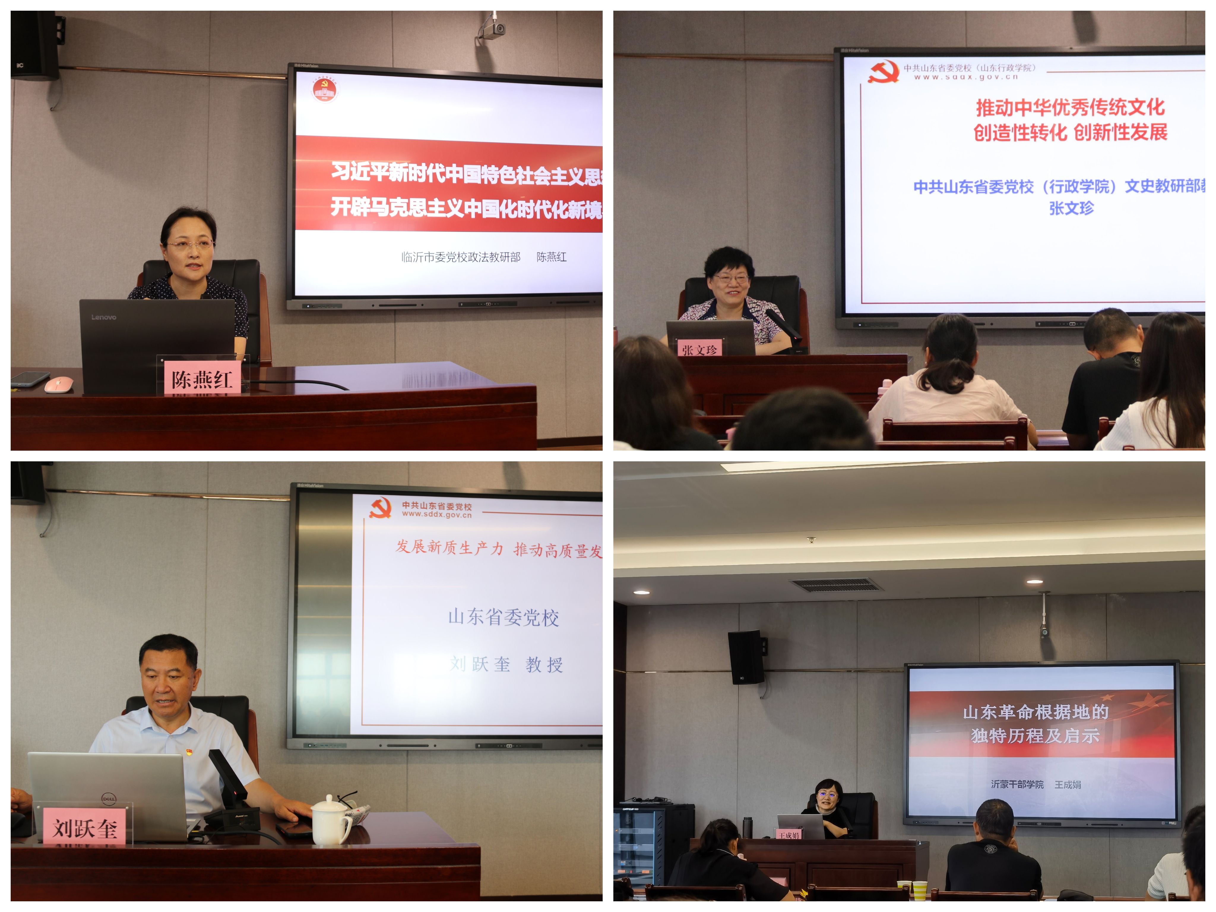 此次培训内容丰富,涵盖理论学习、现场教学、影音教学和研讨交流等环节。理论学习阶段,包括政治理论、党性修养、传统文化和思想引领等内容,先后邀请临沂市委党校政法教研部陈燕红副教授、省委党校文史教研部主任张文珍教授、省委党校新动能研究院刘跃奎教授、沂蒙干部学院沂蒙精神研究部王成娟副教授分别以《习近平新时代中国特色社会主义思想开辟马克思主义中国化时代化新境界》《推动中华优秀传统文化创造性转化和创新性发展》《发展新质生产力,推动高质量发展》《山东革命根据地的独特历程及启示》为题为学员们作了高水平的专题辅导报告。培训内容既有理论阐释又有实践指导,使全体学员充实了知识体系,提升了理论素养,强化了党性修养,增强了实干本领。