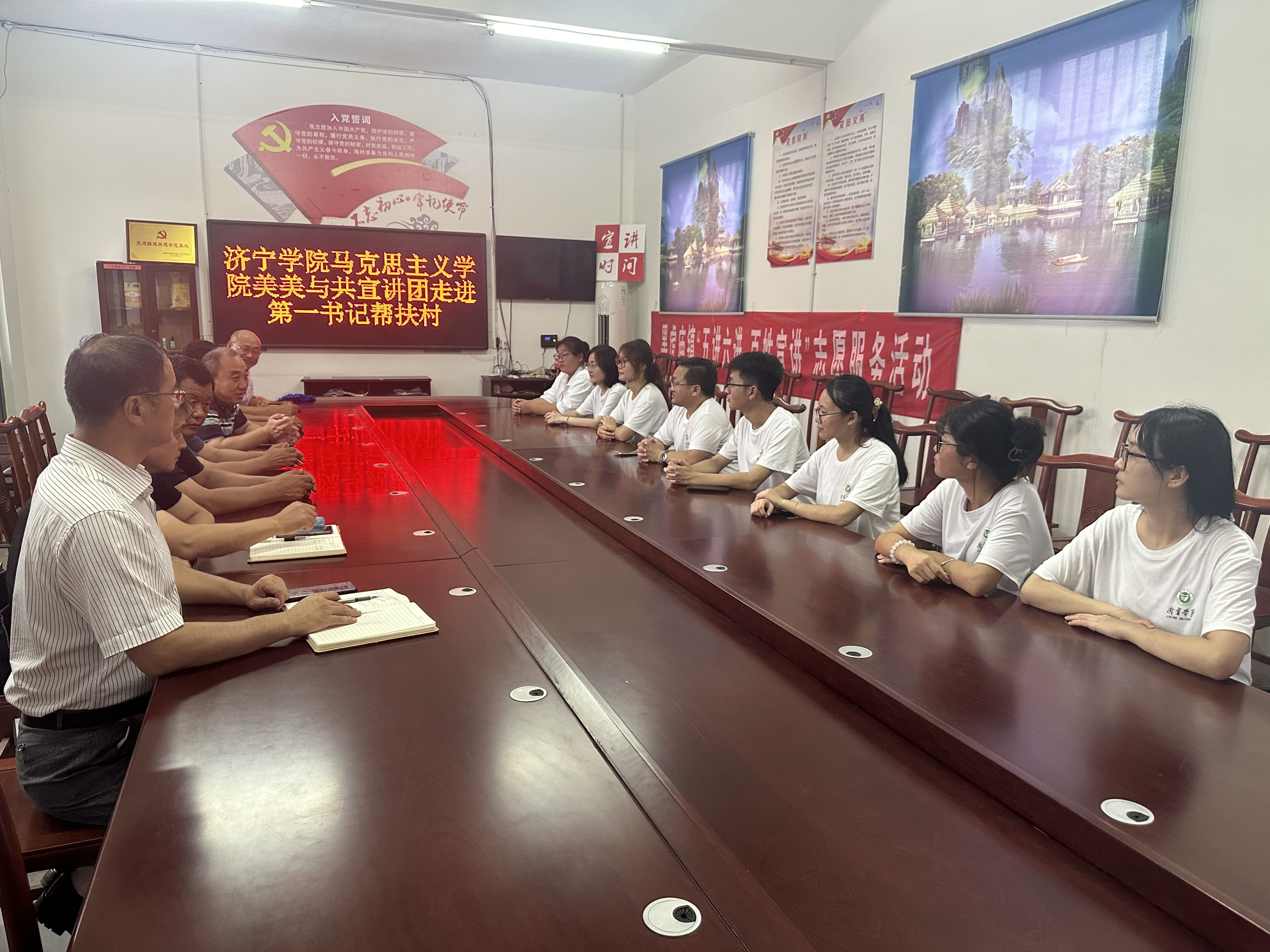 在黑虎庙镇东郭村座谈时,该村村委成员、济宁学院4名省派第一书记对宣讲团成员的到来表示欢迎,感谢宣讲团能够走进乡村送知识、送文化,助力乡风文明和乡村文化振兴。宣讲团成员简要介绍了本次宣讲的目的和精心准备的内容,并就具体细节进行了沟通和讨论。