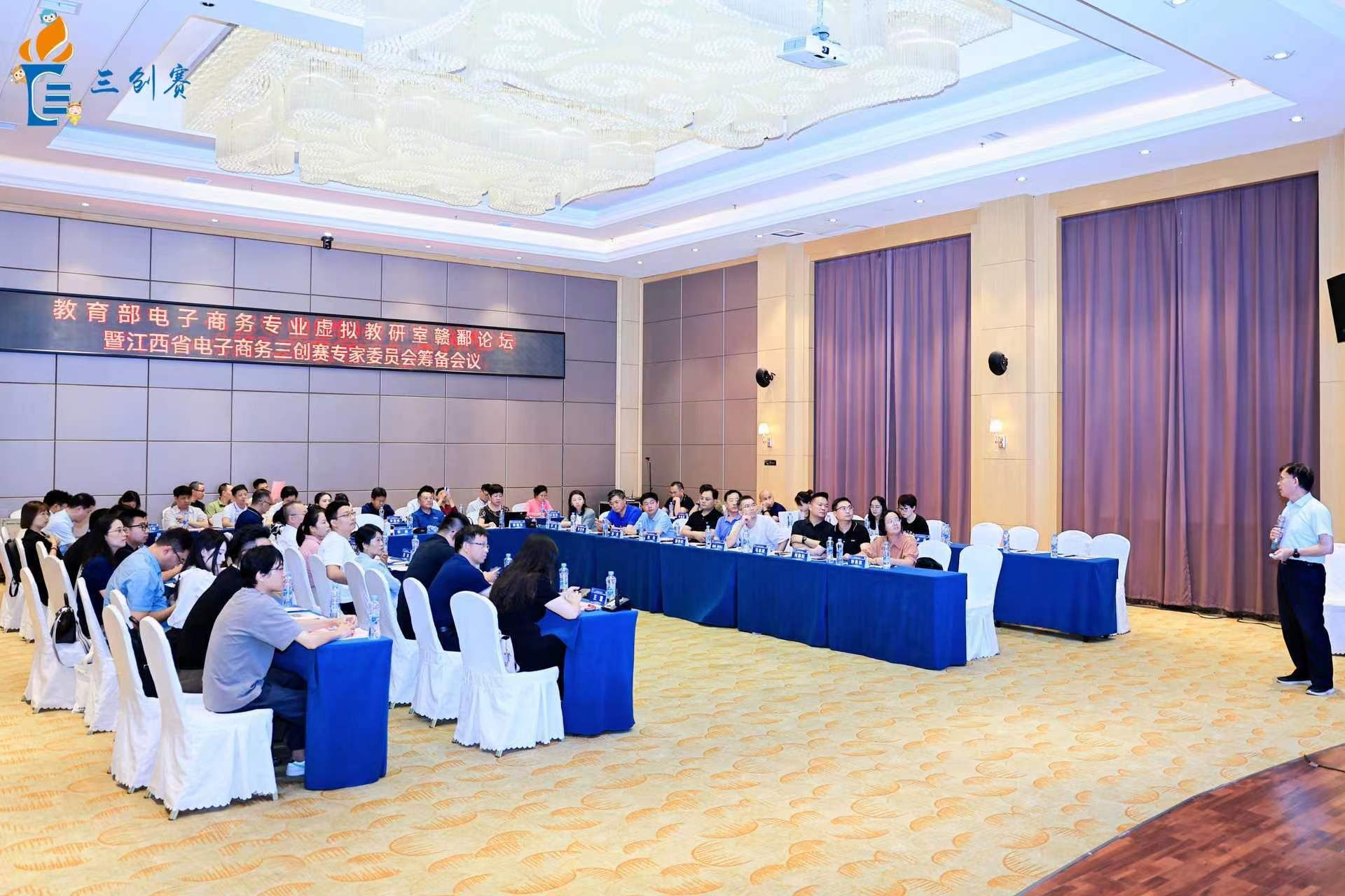 赣鄱论坛由江西应用科技学院常务副校长干甜主持,教育部电子商务专业虚拟教研室负责人、三创赛组委会主席、西安交通大学李琪教授做主旨报告。由厦门大学彭丽芳教授做“大力发展电子商务三创赛”、江西应用科技学院商学院院长王慧教授做“电子商务应用型人才创新创意及创业能力培养思路”、南昌航空大学经济管理学院院长黄蕾教授做“以创新创意及创业引领电子商务专业高质量发展”、武汉惠赠你网络科技有限公司创始人游文超做“BUC平台模式助力产教融合”、薪龙网董事长何振阳做“数智化赋能高校新质人才高质量培养”等主旨报告。韩露代表教研室成员单位汇报了我校上半年建设成效及下半年工作计划,受到与会专家的好评。