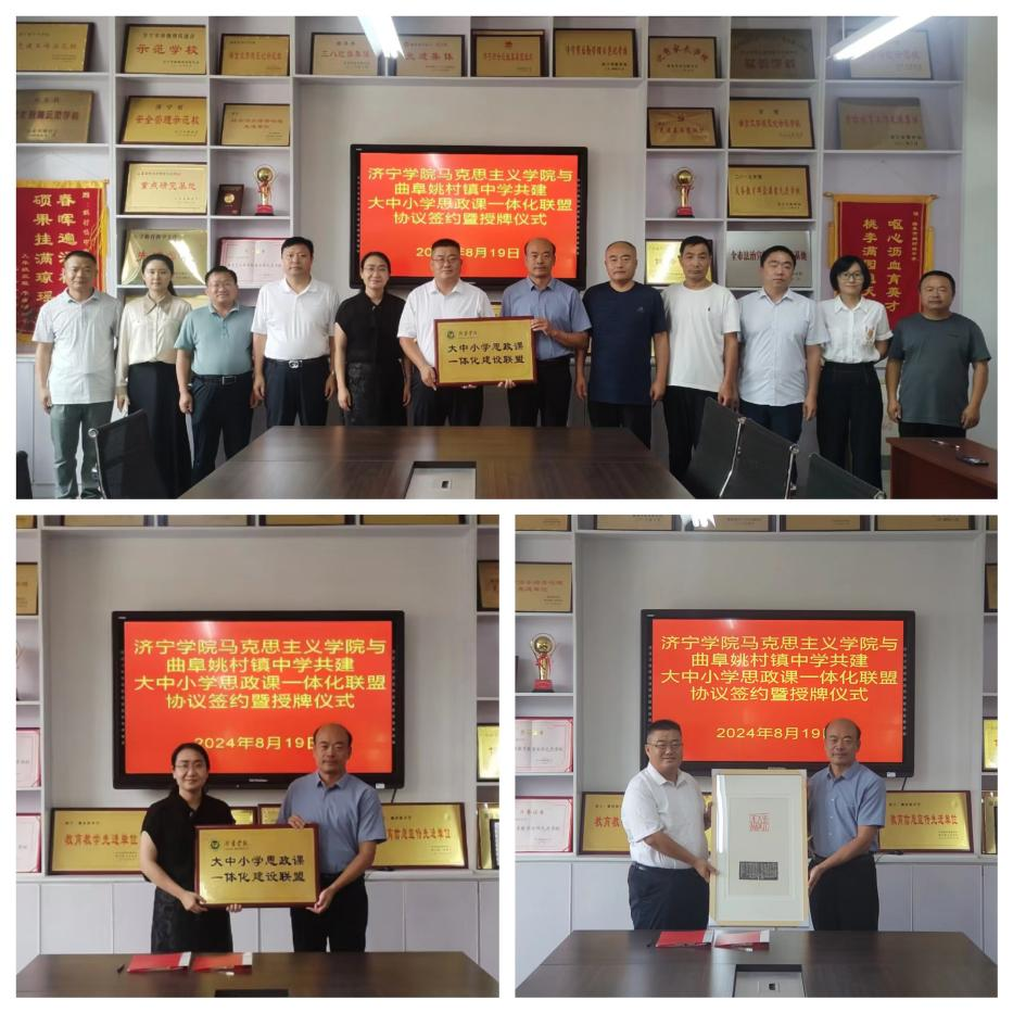 双方签署了共建大中小学思政课一体化联盟协议、共建产业学院合作协议,李效民向曲阜市姚村镇中学赠送了马克思主义学院的文创作品《止于至善》。