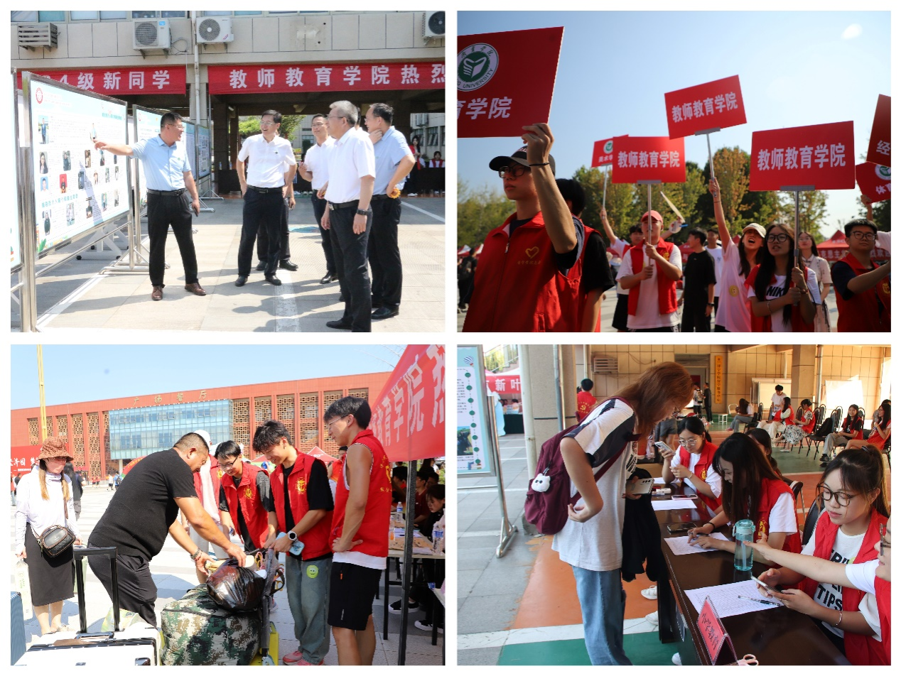 共筑梧桐凤来栖,同迎秋水雁归队。9月7日, 教师教育学院2024级迎新工作顺利开展。学院党委书记刘勇,院长曹光海,党委副书记杜鹃,副院长贾英侠,团委书记徐艳艳,2024级新生辅导员和班主任在新生报到处指导迎新现场工作并与新生及家属亲切交流。