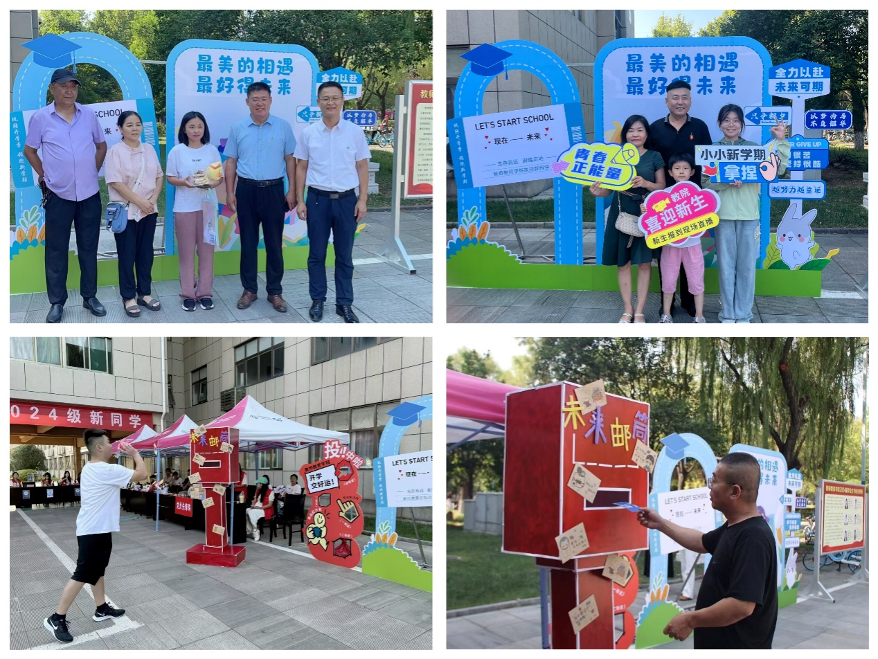 小小惊喜,大大心意。学院特别推出“沙包掷‘彩’”“未来邮箱”“趣味盲盒”以及“朋友圈打卡”等创意多样的迎新系列活动,让同学们迅速感受到浓厚的大学氛围,进一步增强了对大学校园的融入感和归属感;在校学生的手工作品展示吸引了家长们的驻足观看,收获了一致好评;学院简介及教师风采、辅导员和班主任风采、学团活动、榜样引领、2024届毕业生就业基本情况等展板,在展现学院育人风采的同时,帮助同学们全面快速地了解学院基本情况、专业特色,引导其树立明确目标、积极踊跃地度过大学生活;精心装扮的新生报到点,是“萌”新们踊跃打卡的热门之地,“教师教育学院我来啦!”快门定格下的每一帧镜头,记录下新生与济园初见、与教院相拥的精彩瞬间。