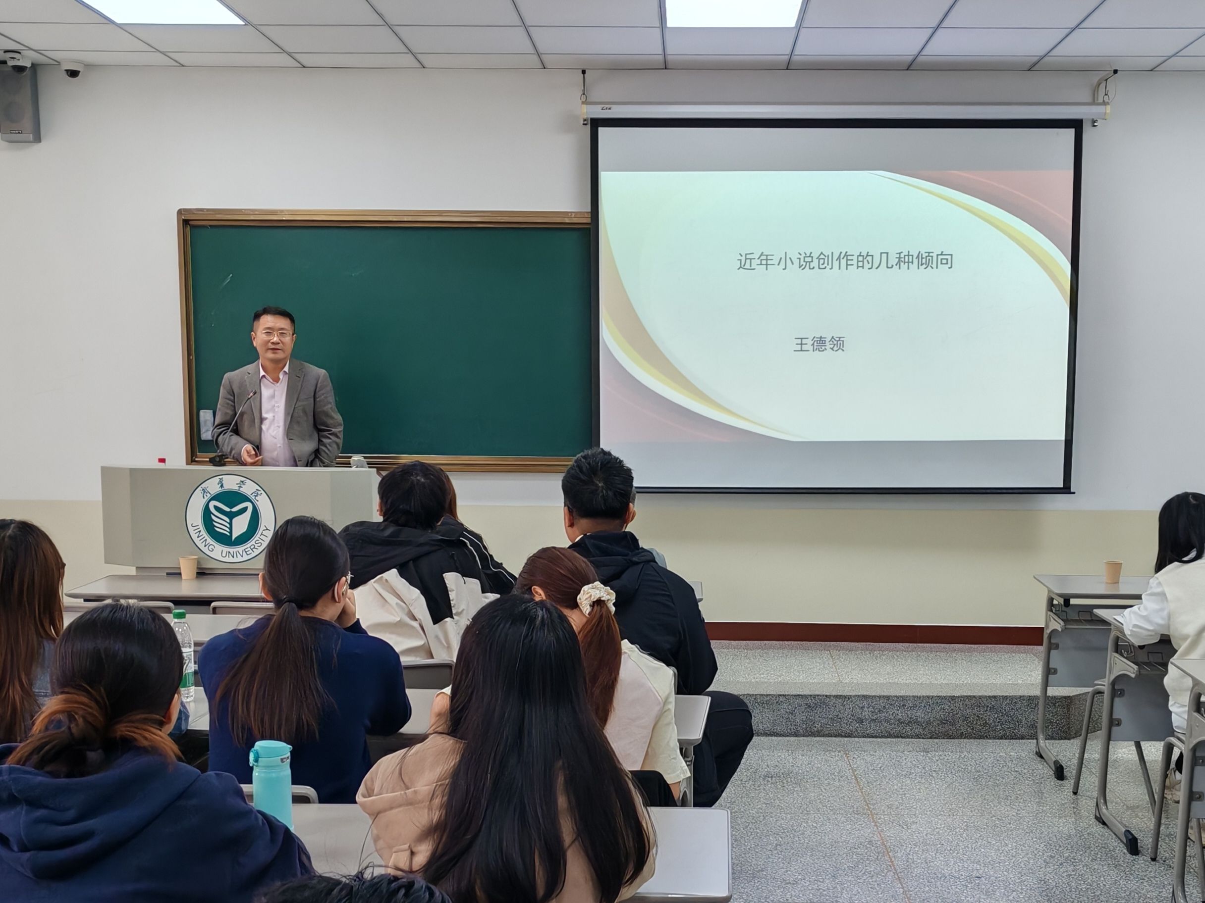 讲座中,王德领教授围绕“近年小说创作倾向” 展开深度剖析。他指出,在当前文学创作语境下,城市题材已逐步取代传统乡土题材的主流地位,乡土题材创作呈现式微态势;同时,他以多部近年具有代表性的长篇小说为案例,详细阐释了 “知识性写作” 在当代文坛的兴起逻辑与创作特征,为学生理解现代文学发展脉络提供了清晰视角。