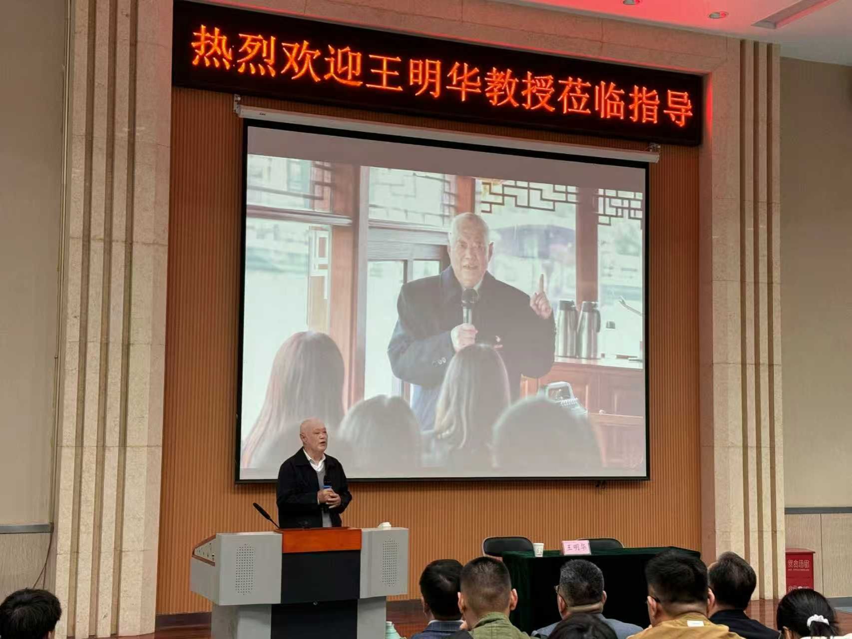 王明华用一张张珍贵的照片和生动的切身经历,从“中国有了共产党”“只有共产党才能救中国”“永远跟党走”三方面生动阐述了中国共产党诞生的时代背景、由弱到强的发展历程和在中国共产党的带领下实现民族独立解放、带领中华民族走向民族复兴的伟大征程和辉煌成就。他结合自己的专业成长经历,以“继先辈遗志,坚决跟党走”的家训,激励全体师生打牢专业基础,听党话跟党走,传承报效家国的理想信念,以高远使命升华青春梦想,以敢为天下先的姿态勇闯“无人区”、勇攀“制高点”。在自由交流的环节,王明华以自身培养博士的具体事例,教导在座的青年教师和学生要打牢专业基础,打破学术藩篱,树立远大目标,学成报效祖国。