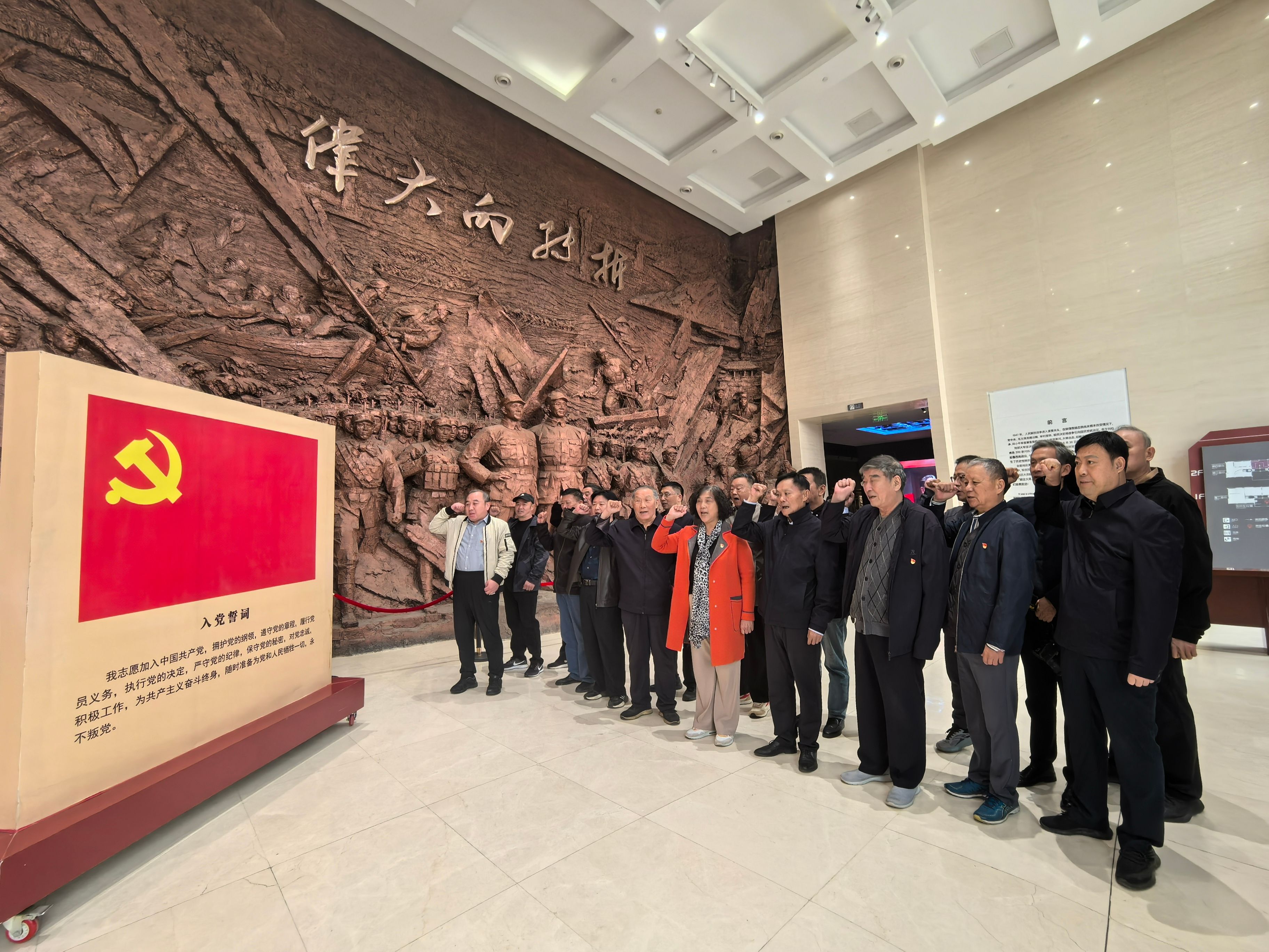 在主题雕塑前,全体党员面向党旗整齐列队,高举右拳,重温入党誓词,用铮铮誓言表达对党的无比热爱和对事业的无限忠诚。
