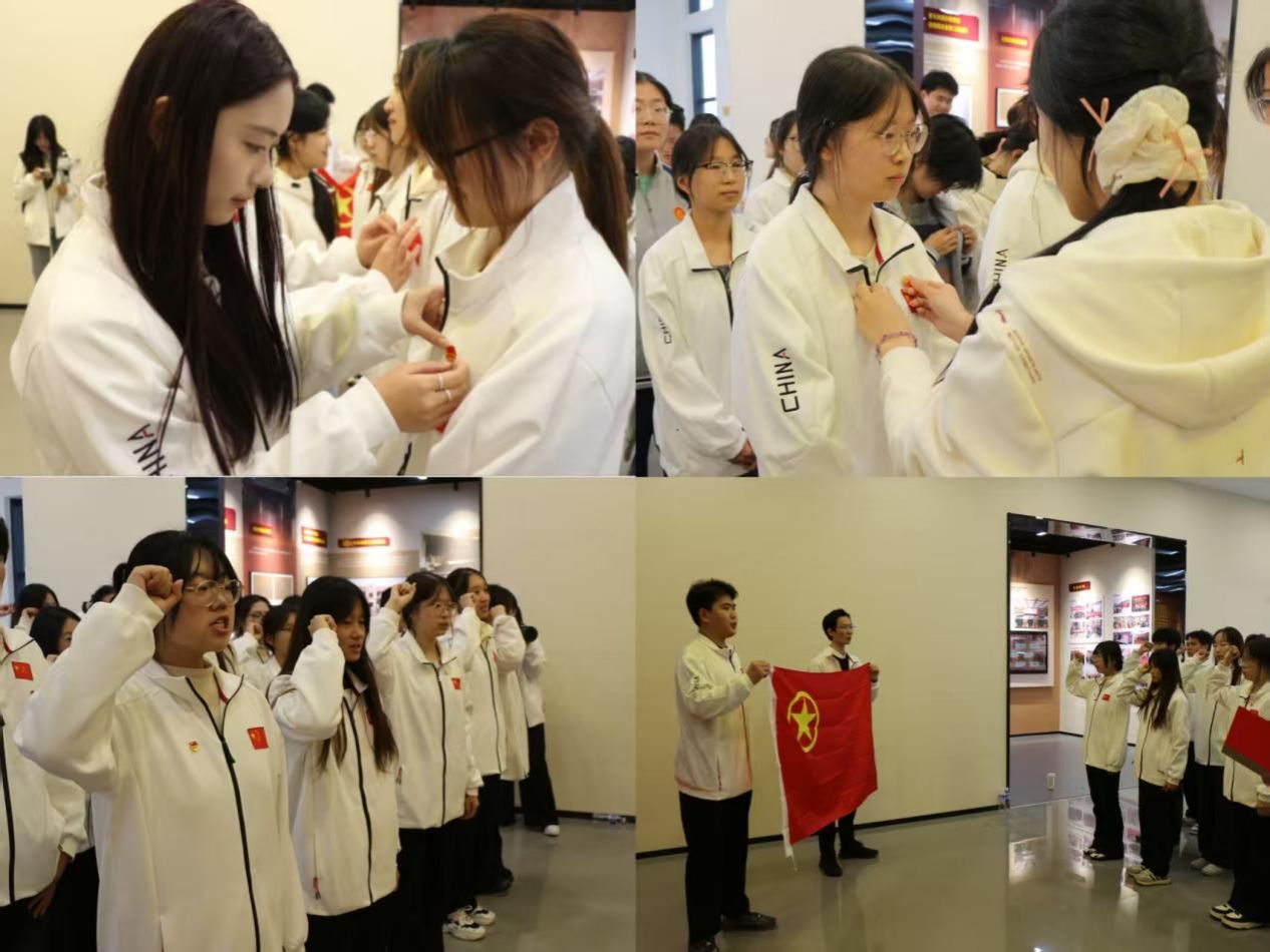 活动中,学院团委组织2025年新发展的团员在展览馆内举行了庄严的入团仪式。老团员代表为新团员佩戴团徽。团徽闪耀在新团员胸前,不仅是一份荣誉的象征,更传递着“传帮带”的责任与使命。新团员高举右拳,面向团旗庄严宣誓,字字千钧,凝聚着新团员对共青团组织的忠诚与为理想奋斗的决心。