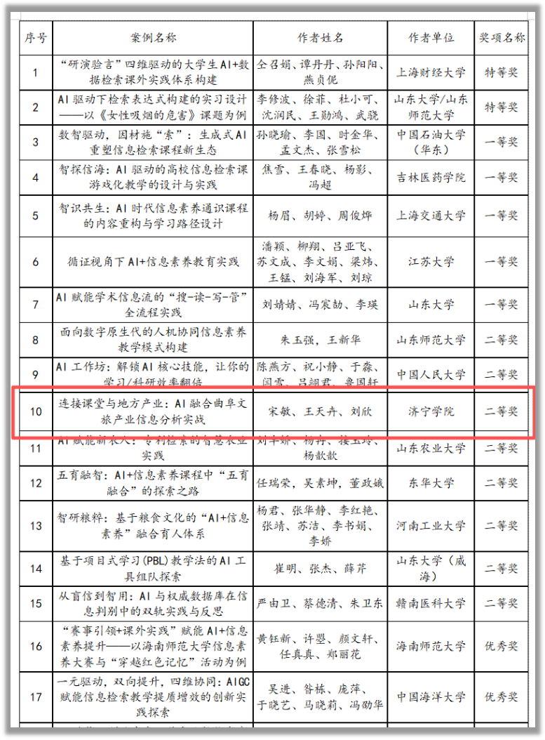 近日,“全国高校AI+信息素养教学改革优秀案例评选”结果正式公布。本次评选共收到全国高校有效申报100余项,评审专家以“全国高校AI+信息素养教学改革优秀教学案例课件评选细则”为准则,经严格评审,评出特等奖2项,一等奖5项,二等奖8项,优秀奖10项。我校图书馆信息素养教学团队提交的案例《连接课堂与地方产业:AI融合曲阜文旅产业信息分析实战》,以鲜明的服务地方特色、可复制推广的课程设计、沉浸式教学实战场景,在与全国众多知名院校同行同台竞技中脱颖而出,荣获二等奖。