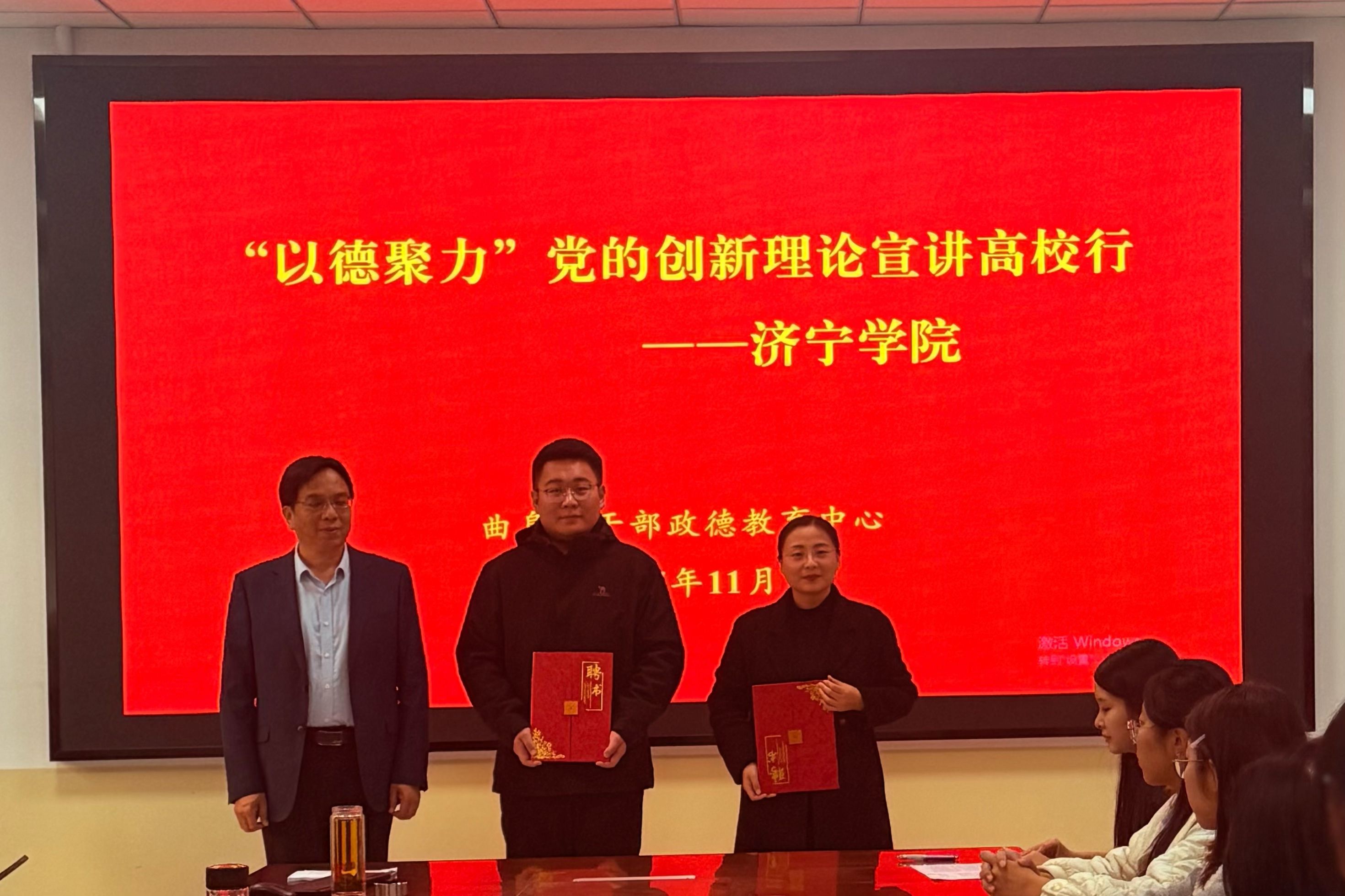本次活动邀请曲阜政德干部教育中心党建科科长、工会主席、团十九大代表马德晓,曲阜市干部政德教育中心青年讲师徐晶与同学们展开文化两创研讨,胡国梁为两位老师颁发“优秀传统文化融入思政课校外指导教师”聘书。