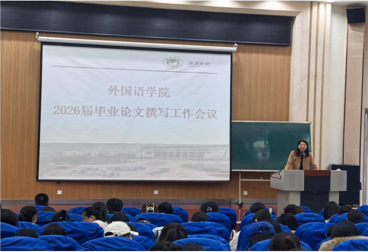 为扎实推进2026届本科毕业生论文指导工作,确保论文写作的规范性与高质量,外国语学院于11月13日下午召开2026届毕业论文工作启动与部署会议。会议由学院学术副院长范莉主持,教学秘书梁长超老师及全体毕业生参加会议。针对实习支教的学生,梁长超老师通过腾讯会议布置论文工作。