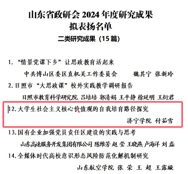 近日,山东省思想政治工作研究会2024年度研究成果拟表扬名单发布,马克思主义学院付茹雪老师的研究成果《大学生社会主义核心价值观的自我培育路径探究》入选二类研究成果,这既是对学院在思想政治工作研究领域深耕细作的肯定,更是学院团队践行理论研究服务青年思想引领需求的生动实践。
