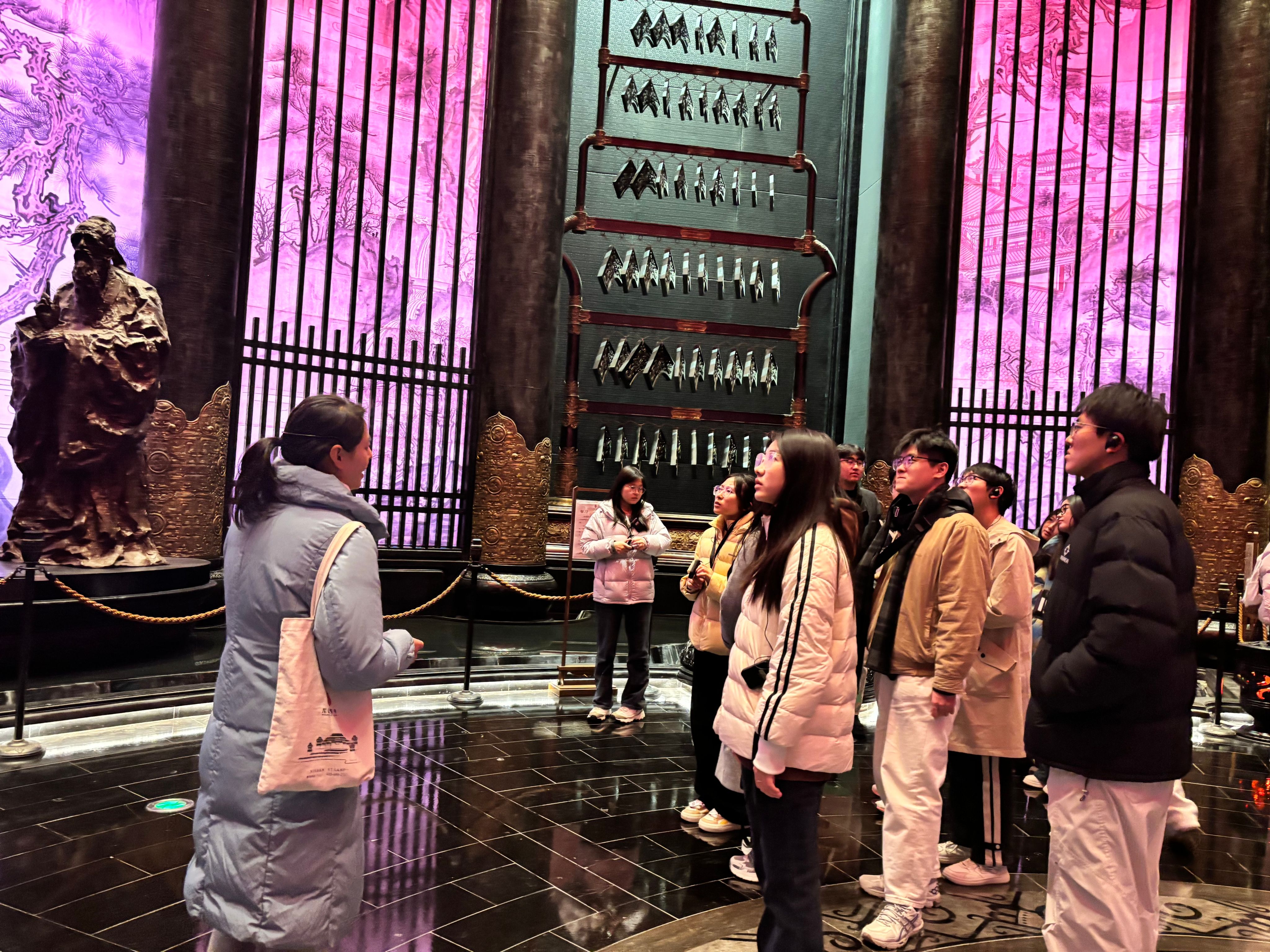 在大学堂内,同学们依次参观了“仁、义、礼、智、信”等主题展厅,通过丰富的文物陈列、生动的场景还原和现代化的互动体验,深入了解了儒家思想的发展脉络和核心内涵。在“仁厅”的仿古建筑前,同学们驻足聆听讲解,感受古代礼乐文明的博大精深;在“智厅”的互动屏幕前,大家积极参与知识问答,体会传统文化的时代价值。整个参观过程中,同学们认真聆听,积极互动,现场学习氛围浓厚。