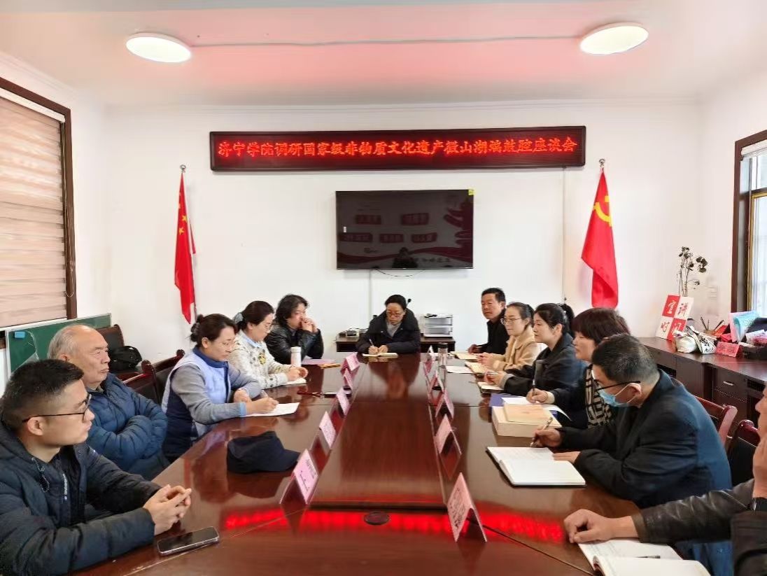 调研期间,在微山县政府办公室统筹安排下,召开了“济宁学院调研国家 级非物质文化遗产微山湖端鼓腔座谈会”。微山县文旅局、档案馆、住建局、 朝阳街道及相关村委负责人参会,就端鼓腔的历史脉络、传承格局与保护路径 进行了交流研讨。团队首先在新建村对端鼓腔民俗活动进行实地记录,从仪程、演出形态、参与群体等方面开展系统田野调查;随后在爱湖村对湖兴村端鼓腔演出进行跟踪记录,进一步补充了有关湖区端鼓腔演唱传统的第一手资料。