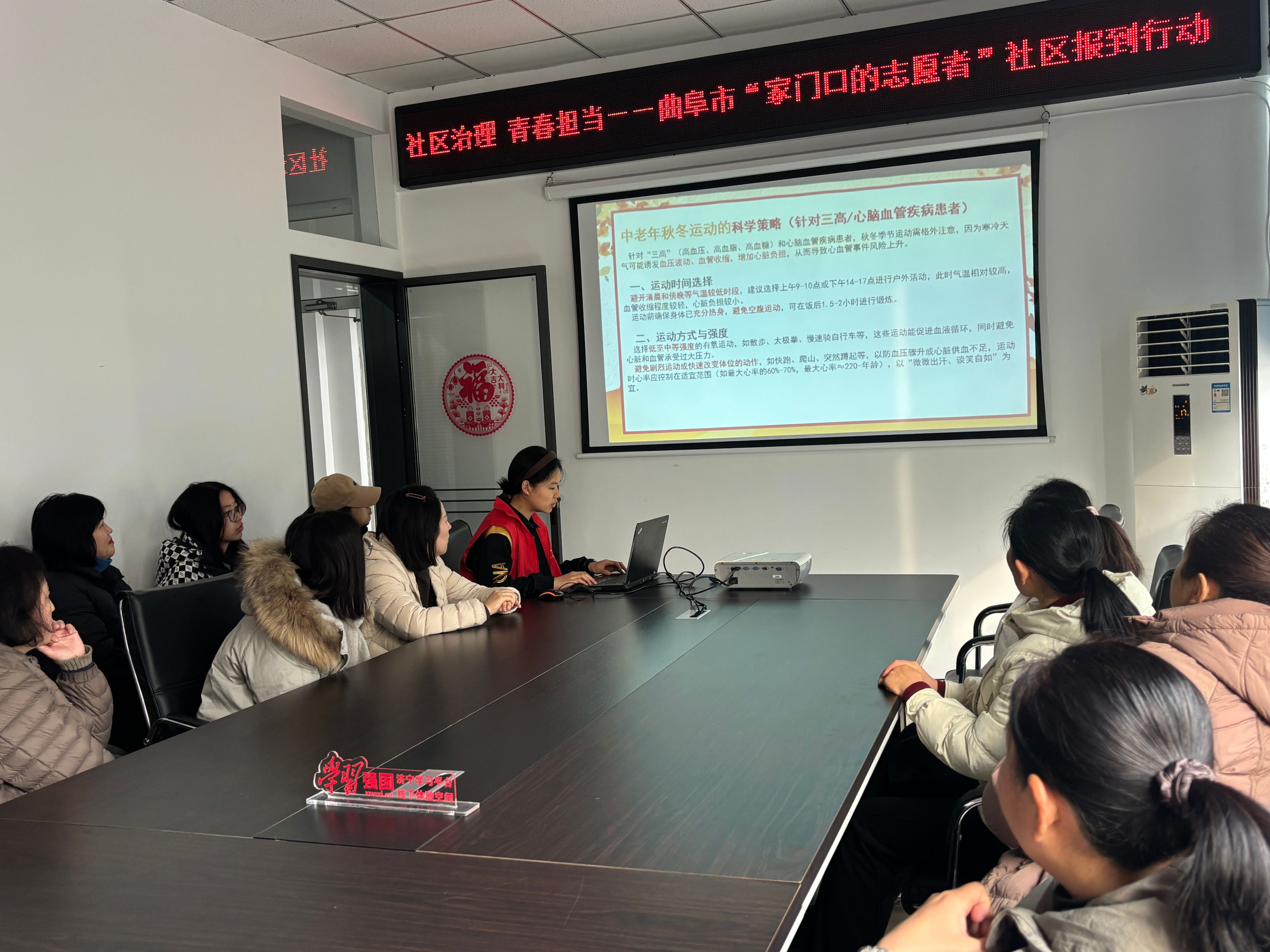 活动伊始,《秋冬季运动保健与损伤防护》专题讲座率先开讲。学生赵晓雅结合秋冬气候特点,聚焦中老年群体核心需求,用通俗易懂的语言拆解运动保健要点。她详细讲解秋冬常见运动损伤的预防与应急处理方法,针对三高、心脑血管疾病患者,结合实际案例给出科学运动建议,助力居民牢固树立“运动循科学,预防筑健康”的理念。