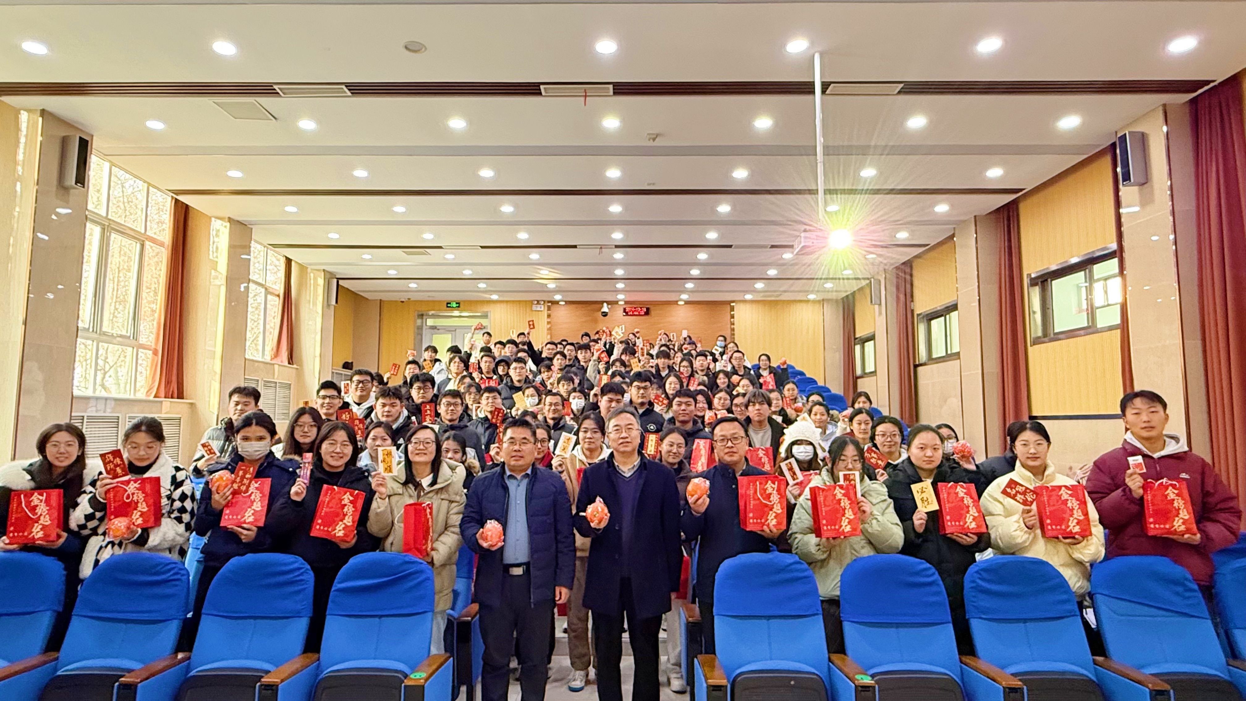 学院精心准备考研加油包,“金榜题名”祝福笔、“纸定上岸”纸巾、暖贴等温暖礼物,搭配寓意“苹”安上岸的苹果、一战‘橙’硕的橙子,由领导老师们亲手送至考研学子手中。一份份礼包,传递的不仅是实用的物资,更是学院对学子们深切的关怀与美好的祝愿,暖意融融,情真意切。最后,师生共同拍摄考研全家福,定格温暖瞬间。