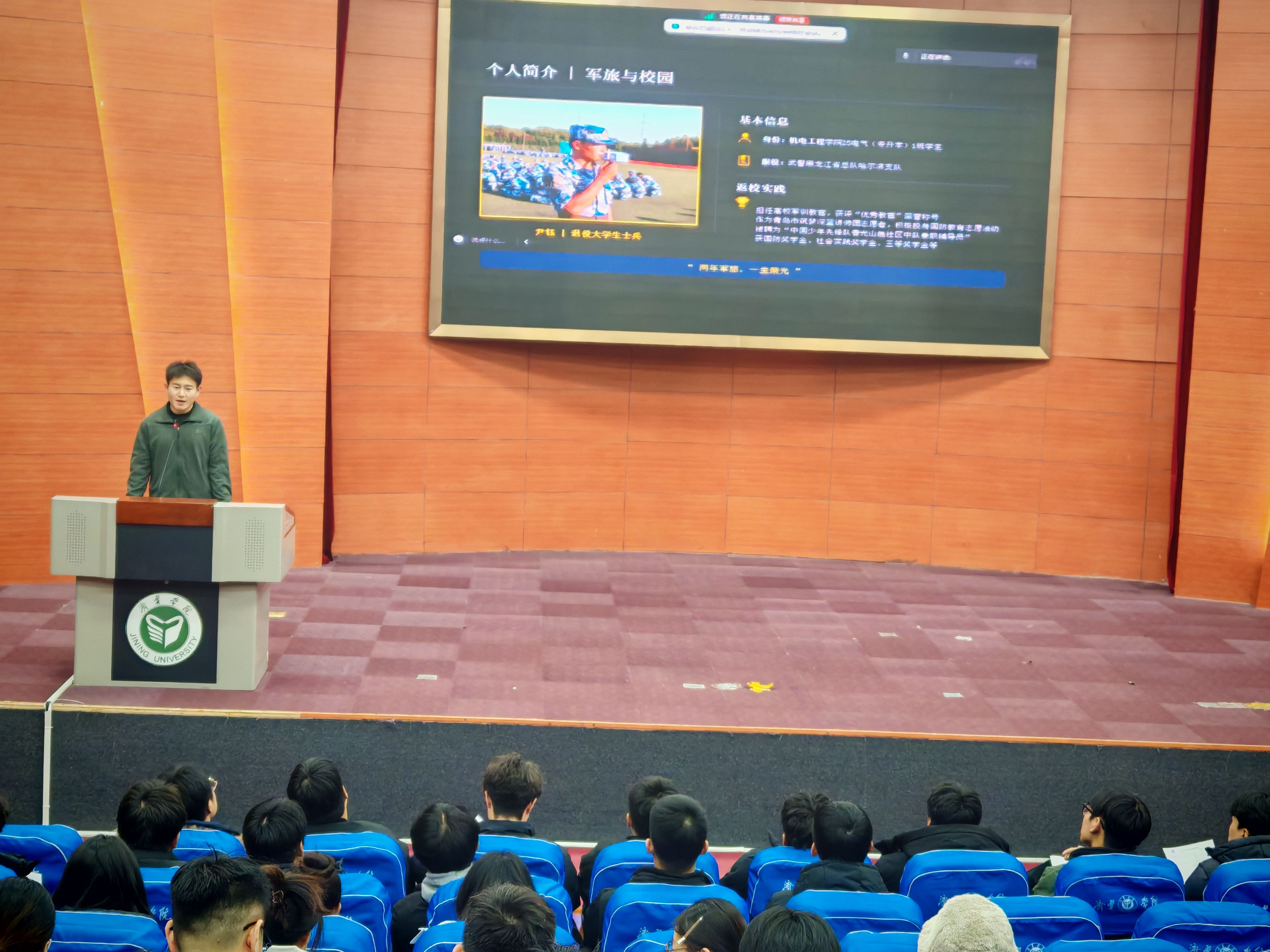 为深入学习贯彻习近平强军思想,扎实推进2026年征兵动员工作,精准普及征兵政策,进一步强化青年学子国防观念与爱国情怀,12月30日,机电工程学院在理科楼报告厅举办“青春献国防 逐梦在军营”征兵宣讲会。机电工程学院毕业班辅导员及2026届毕业生参加了此次宣讲会,会议由李威主持。