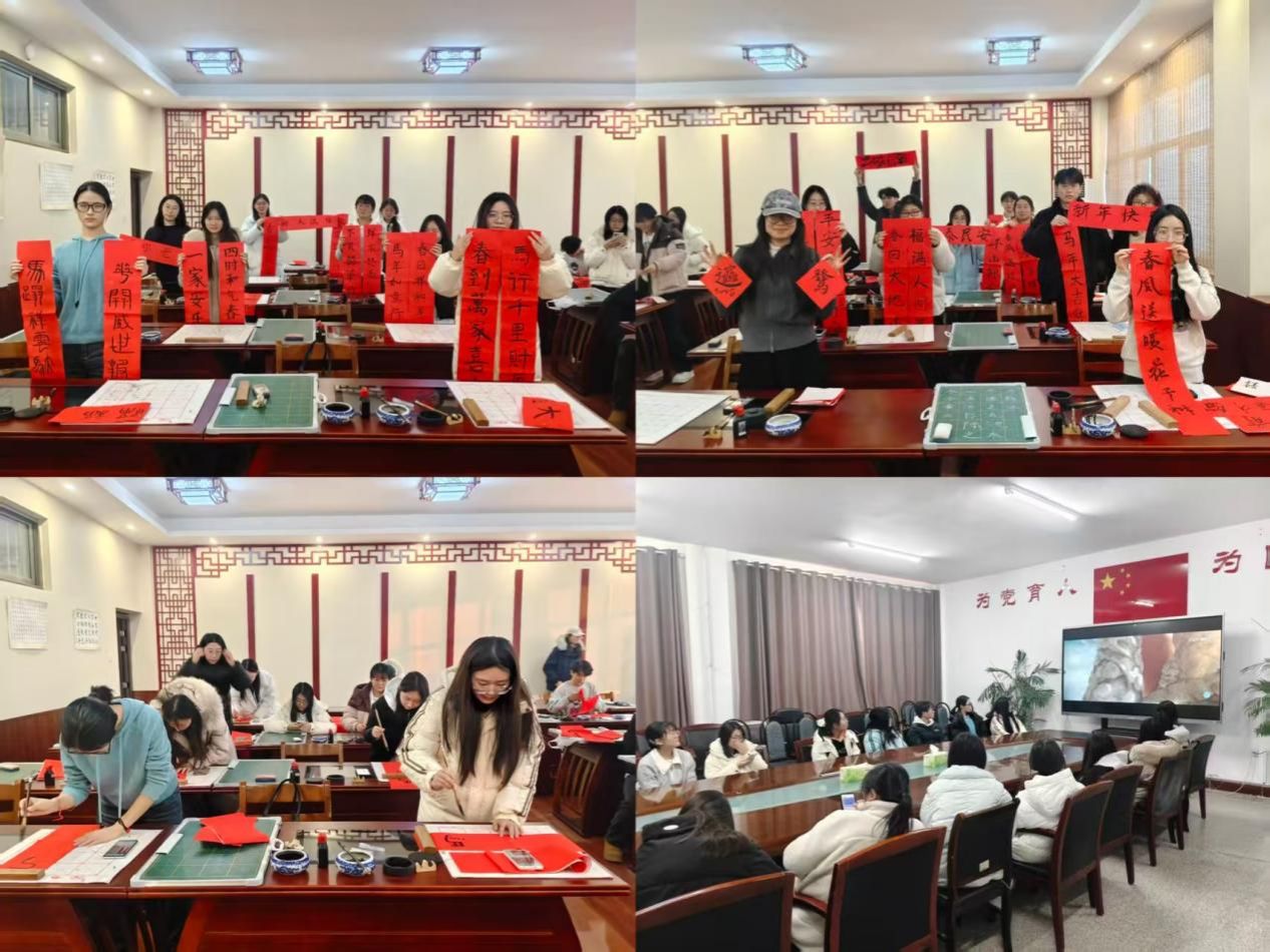 为丰富学子假期生活,1月2日至3日,学院组织“笔墨生香书新福”毛笔字写春联活动和观影活动。在写毛笔字中,学子们在红色对联纸与福纸上挥毫泼墨,笔走龙蛇间书写对新年的美好期许,一幅幅饱含心意的春联与福字张贴于宿舍门楣,进一步传承了中华优秀传统文化。