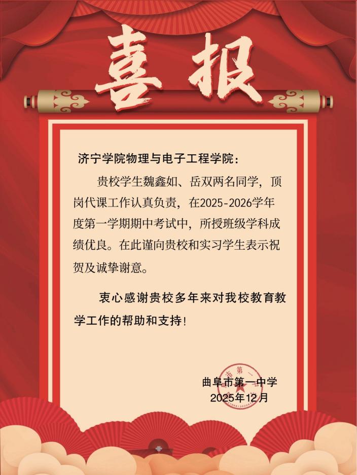 1月7日,物理与电子工程学院收到合作学校曲阜市第一中学发来的感谢信,信中对学院本学期派出进行拓展实习的魏鑫如和岳双两名同学给予高度评价,对她们在本学期的优异表现表示诚挚感谢。