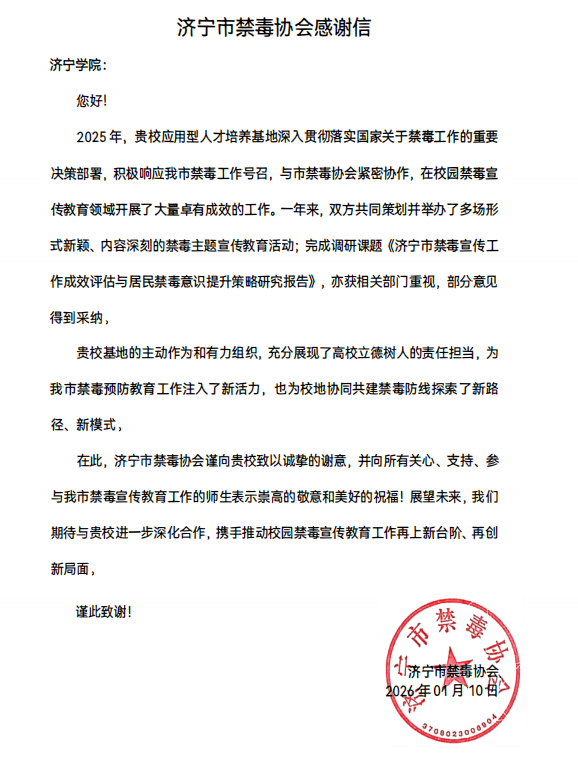 近日,济宁市禁毒协会向我校发来感谢信,感谢我校应用型人才培养基地在2025年校园禁毒宣传教育领域开展了大量卓有成效的工作。