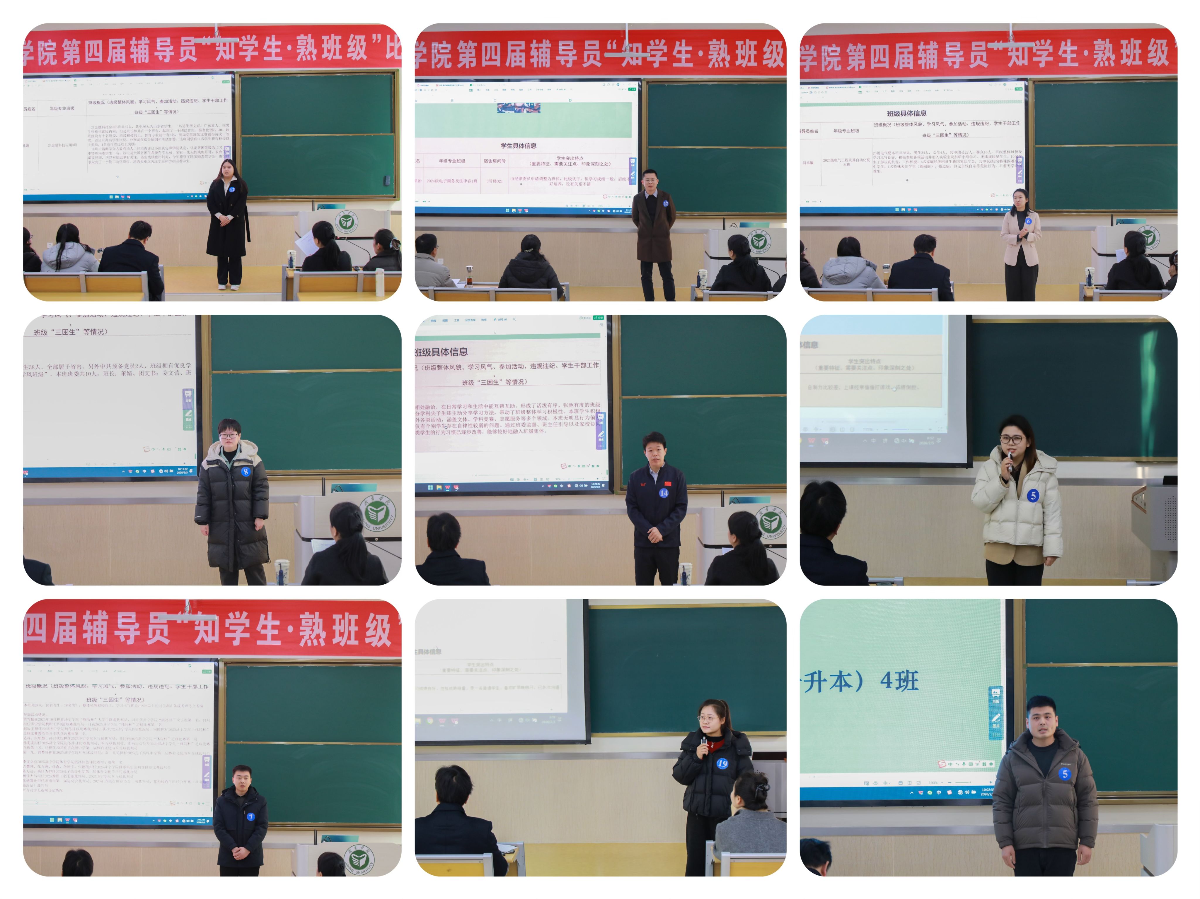 为锤炼辅导员了解学生、熟悉班级的履职基本功,切实提升辅导员综合育人能力,2月6日学校成功举办第四届辅导员“知学生·熟班级”比赛。全校共38名辅导员参加比赛,各二级学院党委副书记、学生工作处相关人员担任评委。