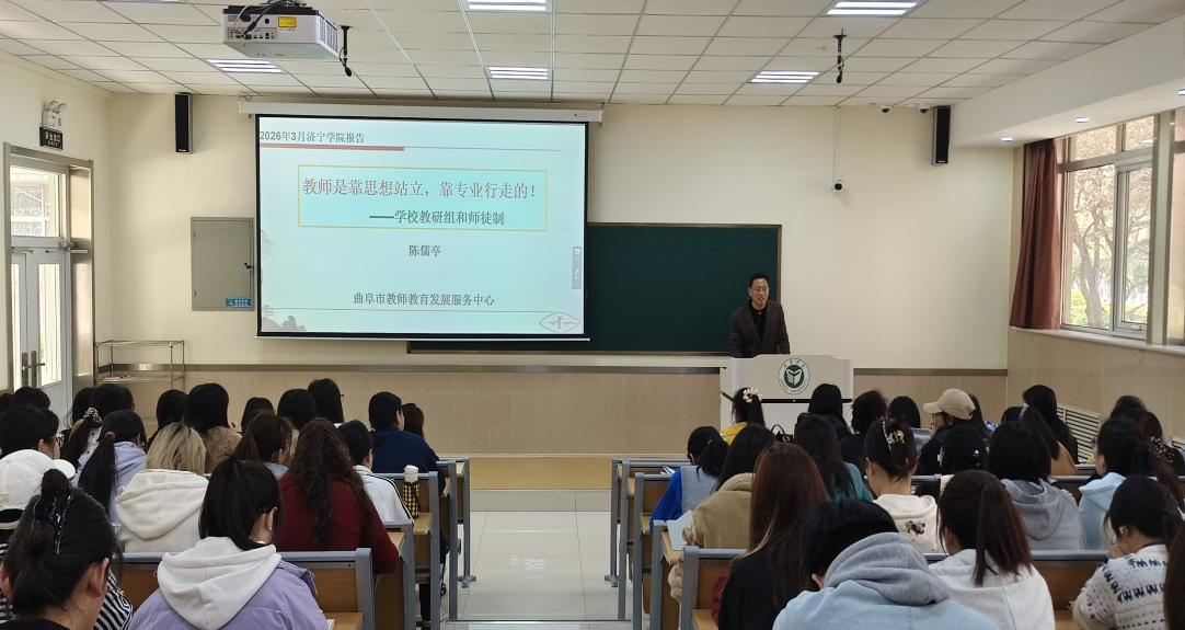 3月31日上午,外国语学院"师范生从业技能培养工作坊"第四十五期在3C101报告厅如期举行。曲阜市教师教育发展服务中心陈儒亭主任应邀作题为《学校教研组和师徒制》的专题讲座,2024级英语师范专升本专业百余名同学现场聆听。学院英语系马慧老师主持了此次活动。