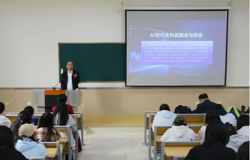 讲座围绕三个核心环节有序推进、层层深入。首先,王文峰分享了从校园走向社会的点滴感悟,回忆了当年在课堂上汲取知识、在图书馆埋头苦读、与同学结下深厚友谊的青春岁月。他鼓励同学们珍惜大学时光,打牢专业基础,同时保持对新鲜事物的好奇心与探索精神,为未来的就业与创业积蓄力量。随后,王文峰从商界视角出发,系统分享了自己十四年来的创业经历。他结合自身从技术岗位到创立京拍档的转型过程,深入剖析了AI技术对文科类职业的深刻影响。他指出,人工智能并非文科生的“对手”,而是强大的“助手”。文科生在内容创意、用户共情、品牌叙事、文化理解等方面具有不可替代的优势,若能主动学习并善用AI工具,将在电商运营、数字营销、智能产品内容策划等领域大有可为。他鼓励同学们打破专业壁垒,敢于跨界尝试,在AI时代中找到属于自己的赛道。最后,王文峰围绕“新时代背景下,大学生如何抗住家庭以及社会压力走出创业第一步”“如何利用现有地域营商环境,结合当下实际情况对创新创业进行助力”等问题与同学们展开深入交流,并结合自身创业初期的真实经历,耐心解答了同学们关于压力应对、资源获取、心态调整等方面的困惑。